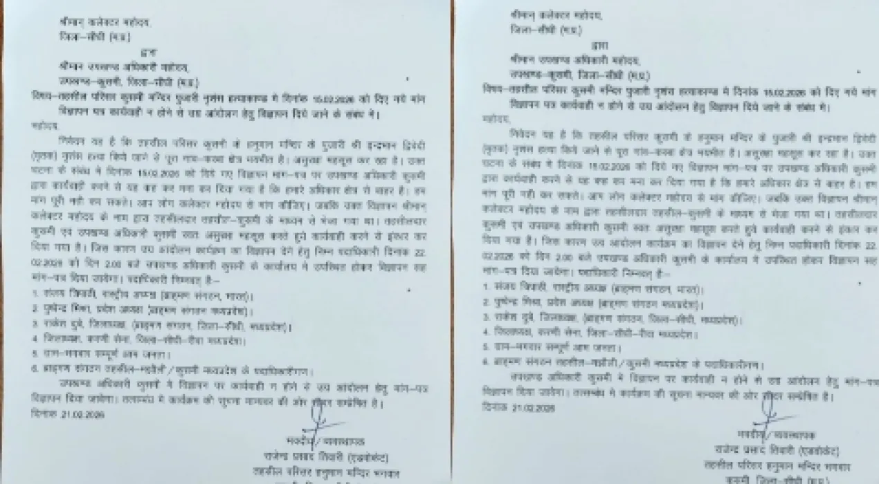 वही मिली जानकारी के अनुसार, तहसील परिसर कुसमी स्थित हनुमान मंदिर के पुजारी की हत्या के विरोध में पहले ही 15 फरवरी 2026 को एक मांग-पत्र दिया गया था। यह मांग-पत्र कलेक्टर के नाम तहसीलदार कुसमी के माध्यम से भेजा गया था। लेकिन आवेदक पक्ष का आरोप है कि उपखण्ड अधिकारी कुसमी ने यह कहते हुए कार्यवाही से इंकार कर दिया कि मामला उनके अधिकार क्षेत्र से बाहर है।