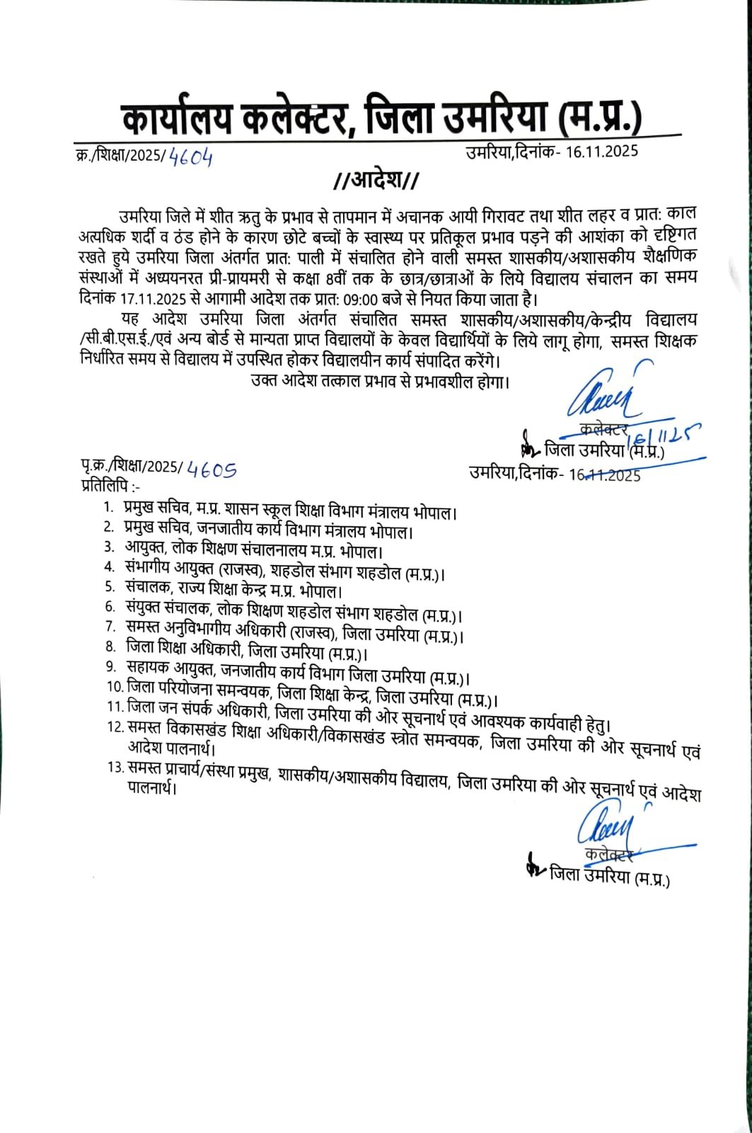 उमरिया में बढ़ती सर्दी से स्कूलों का समय बदला, कक्षा 8वीं तक सुबह 9 बजे से लगेगी कक्षाएं उमरिया तपस गुप्ता (7999276090) जिले में ...