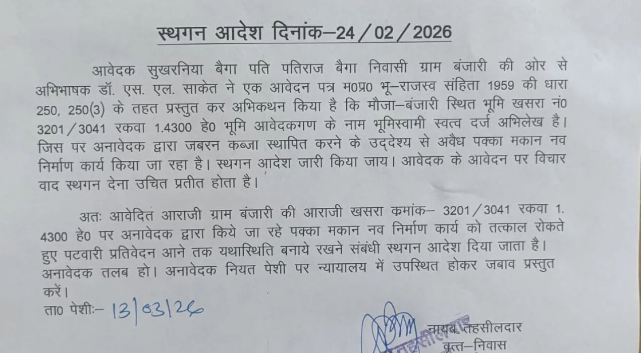 एमपी के सिंगरौली जिले में आदिवासी भूमि से जुड़ा एक संवेदनशील मामला तूल पकड़ता जा रहा है। सरई तहसील अंतर्गत ग्राम बंजारी में बैगा परिवारों की वंटन (शासकीय पट्टेदार) भूमि पर कथित अतिक्रमण के आरोपों के बीच प्रशासन ने सख्ती दिखाते हुए एक शिक्षक समेत अनावेदकों को नोटिस जारी किया है। तहसीलदार न्यायालय सरई ने सभी पक्षों को 13 मार्च 2026 को उपस्थित होकर जवाब और साक्ष्य प्रस्तुत करने के निर्देश दिए हैं।