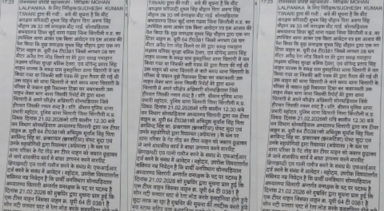 वही मिली जानकारी के अनुसार, वन विभाग के बीट गार्ड शुभम सिंह चौहान (33) ने आवेदन प्रस्तुत कर बताया कि 21 फरवरी 2026 की रात लगभग 12:30 बजे मुखबिर से सूचना मिली थी कि सोन नदी के पनवार घाट से अवैध रेता लोड कर एक नीले रंग का टीपर वाहन (क्र. यूपी 64 टी 0381) कुसहनिया मार्ग से सुदा की ओर जा रहा है। सूचना की तस्दीक करते हुए वन टीम मौके पर पहुंची और वाहन को लगभग 08 घन मीटर अवैध रेता के साथ पकड़ा।