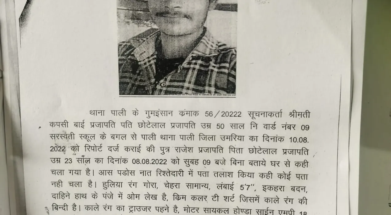 मामले के अनुसार, थाना पाली में गुमशुदगी क्रमांक 56/2022 के तहत कपसी बाई प्रजापति (50 वर्ष), निवासी वार्ड नंबर 09, सरस्वती स्कूल के पास, पाली ने 10 अगस्त 2022 को अपने बेटे राजेश प्रजापति (23 वर्ष) के लापता होने की रिपोर्ट दर्ज कराई थी। उन्होंने बताया कि 8 अगस्त 2022 की सुबह करीब 9 बजे राजेश बिना किसी को बताए घर से कहीं चला गया था। इसके बाद से उसका कोई सुराग नहीं मिला।