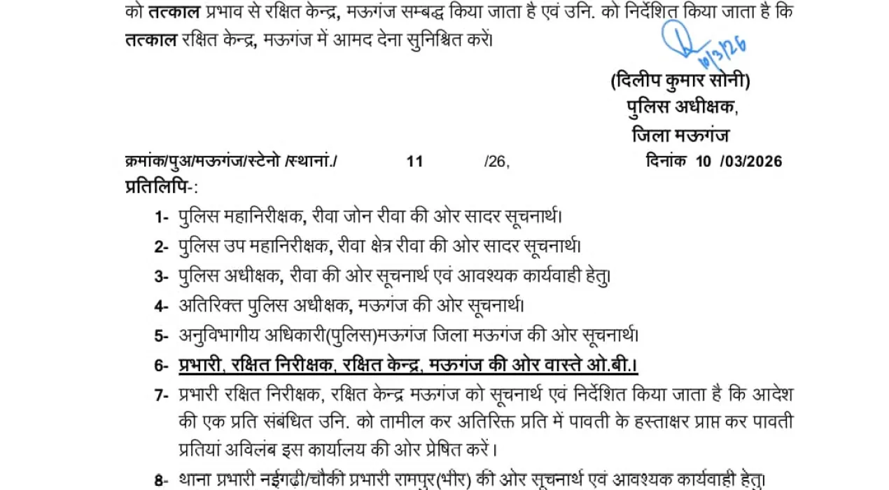 इस जारी आदेश के अनुसार माननीय उच्च न्यायालय जबलपुर में दायर याचिका डब्ल्यूपी क्रमांक 4851/2026 (रमेश कुमार तिवारी विरुद्ध मध्यप्रदेश शासन) में थाना प्रभारी नईगढ़ी को कुछ आवश्यक निर्देश दिए गए थे। बताया गया है कि न्यायालय के इन निर्देशों का पालन करने के बजाय थाना प्रभारी द्वारा लापरवाही बरती गई और आदेशों की अवहेलना की गई। इस मामले को गंभीरता से लेते हुए पुलिस अधीक्षक मऊगंज ने अनुशासनात्मक कार्रवाई करते हुए उन्हें तत्काल प्रभाव से उनके पद से हटाकर रक्षित केन्द्र मऊगंज में संबद्ध कर दिया।