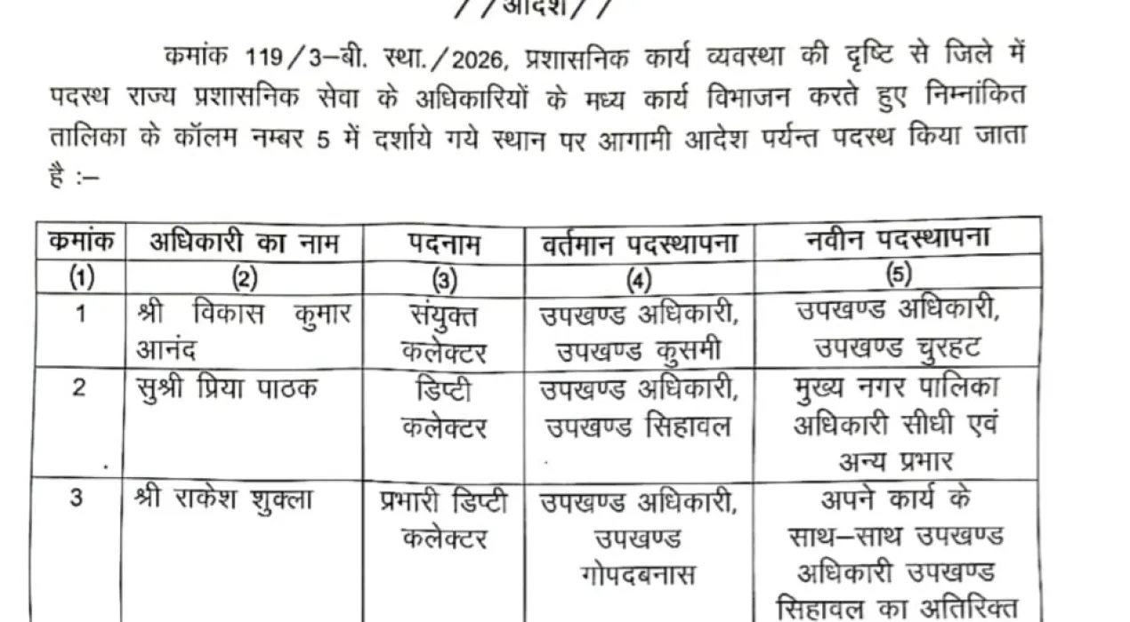 एमपी के सीधी जिले में प्रशासनिक व्यवस्था को और अधिक प्रभावी एवं सुचारू बनाने के उद्देश्य से कलेक्टर द्वारा बड़े स्तर पर अधिकारियों के तबादले किए गए हैं। सोमवार को जारी आदेश के अनुसार राजस्व एवं प्रशासनिक विभाग से जुड़े कई अधिकारियों की नई पदस्थापना की गई है। कलेक्टर के इस फैसले को प्रशासनिक कार्यों में गति लाने और व्यवस्थाओं को मजबूत करने की दिशा में महत्वपूर्ण कदम माना जा रहा है।