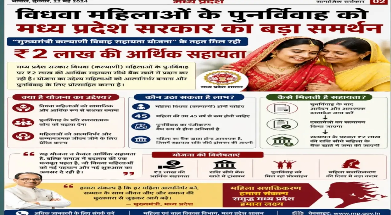 भोपाल। समाज में विधवा महिलाओं को सम्मानजनक जीवन और आत्मनिर्भरता की दिशा में आगे बढ़ाने के उद्देश्य से मध्य प्रदेश सरकार ने एक सराहनीय पहल की है। “मुख्यमंत्री कल्याणी विवाह सहायता योजना” के तहत अब विधवा (कल्याणी) महिलाओं के पुनर्विवाह पर राज्य सरकार ₹2 लाख की आर्थिक सहायता सीधे उनके बैंक खाते में प्रदान कर रही है।