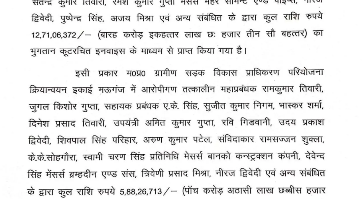 अब इसी प्रकार मऊगंज इकाई में भी रामकुमार तिवारी, जुगल किशोर गुप्ता, ए.के. सिंह, सुजीत कुमार निगम, भास्कर शर्मा, दिनेश प्रसाद तिवारी, अमित कुमार गुप्ता, रवि गिडवानी, उदय प्रकाश द्विवेदी, अरुण कुमार पटेल सहित कई अधिकारियों व ठेकेदारों के खिलाफ मामला दर्ज किया गया है।