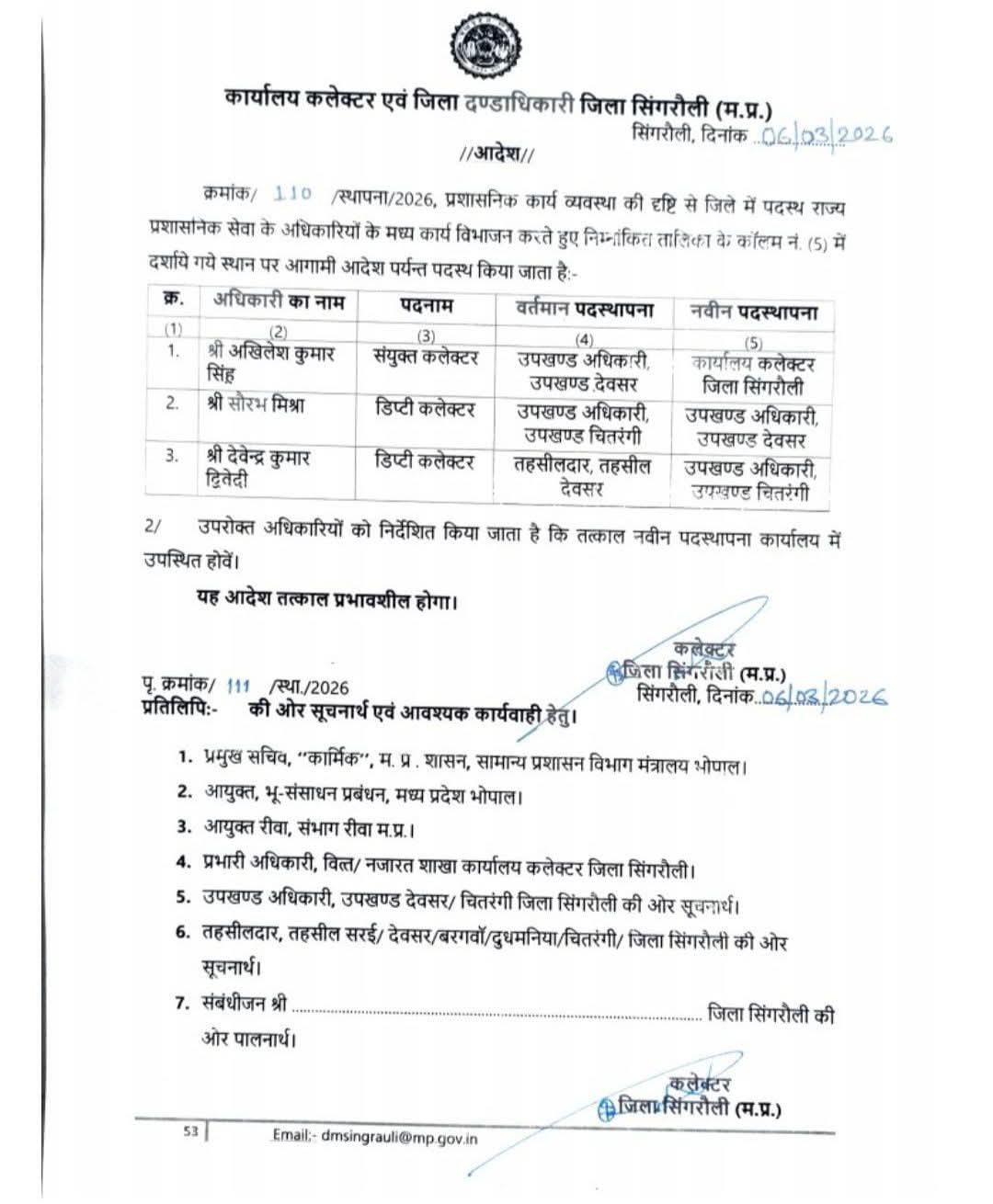 वही सिंगरौली कलेक्टर द्वारा जारी आदेश में स्पष्ट निर्देश दिए गए हैं कि सभी अधिकारी तत्काल प्रभाव से अपने नवीन पदस्थापना स्थल पर उपस्थित होकर कार्यभार ग्रहण करें। यह आदेश तत्काल प्रभावशील माना जाएगा।
