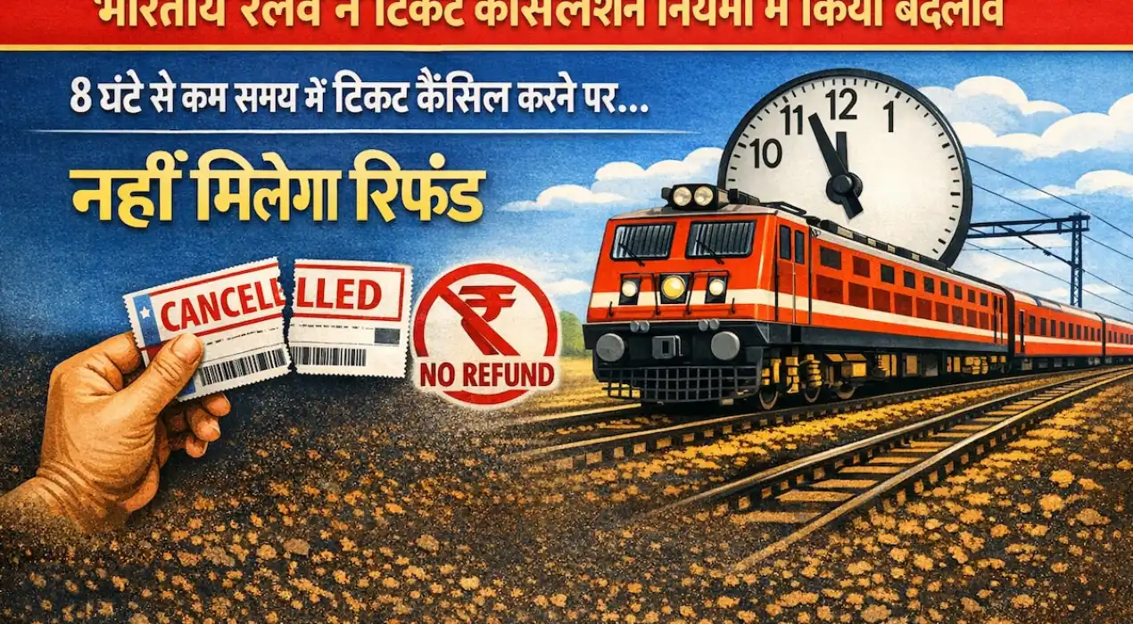 रेलवे ने अब ‘लास्ट मिनट’ रिफंड की सुविधा लगभग खत्म कर दी है. यदि ट्रेन छूटने में 8 घंटे से कम का समय बचा है, तो टिकट कैंसिल कराने पर शून्य (Zero) रिफंड मिलेगा. पहले यात्रियों को 4 घंटे पहले तक कुछ रिफंड मिल जाता था, लेकिन अब यह समय सीमा बढ़ाकर 8 घंटे कर दी गई है.