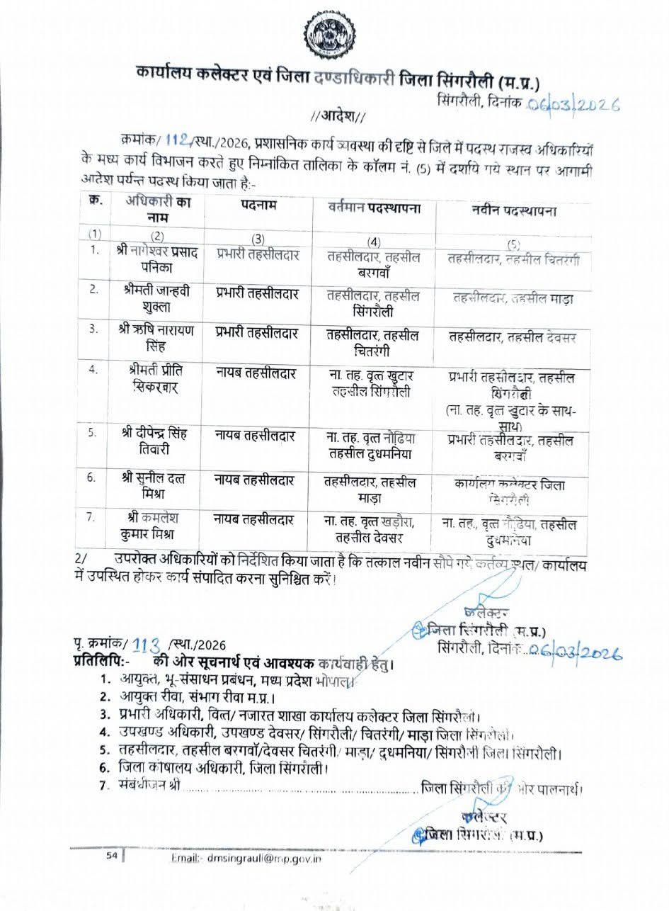 तहसीलदारों को कार्य व्यवस्था को देखते हुए कलेक्टर सिंगरौली ने आदेश जारी किया है और कई अधिकारियों को इधर से उधर भेज दिया है। मध्य प्रदेश के सिंगरौली जिले में प्रशासनिक व्यवस्था को और अधिक प्रभावी बनाने के उद्देश्य से कलेक्टर द्वारा 6 मार्च को तहसीलदारों के तबादले का आदेश जारी किया गया है। जारी आदेश के तहत जिले के कई तहसीलदारों को इधर-उधर स्थानांतरित करते हुए नई जिम्मेदारी सौंपी गई है।
