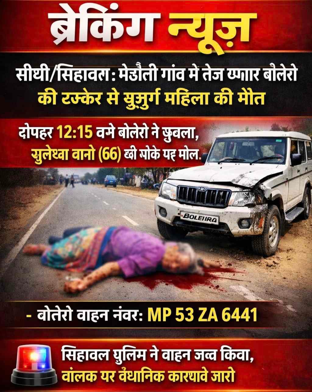 Sidhi news:मेढौली में तेज रफ्तार का कहर, बोलेरो की टक्कर से बुजुर्ग महिला की मौके पर मौत