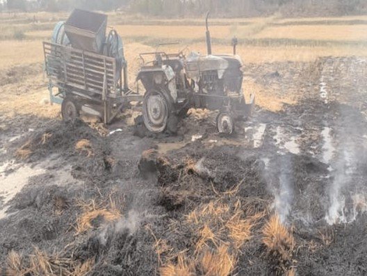 Sidhi news:खलिहान में लगी आग फसल समेत जल गया ट्रैक्टर थ्रेसर