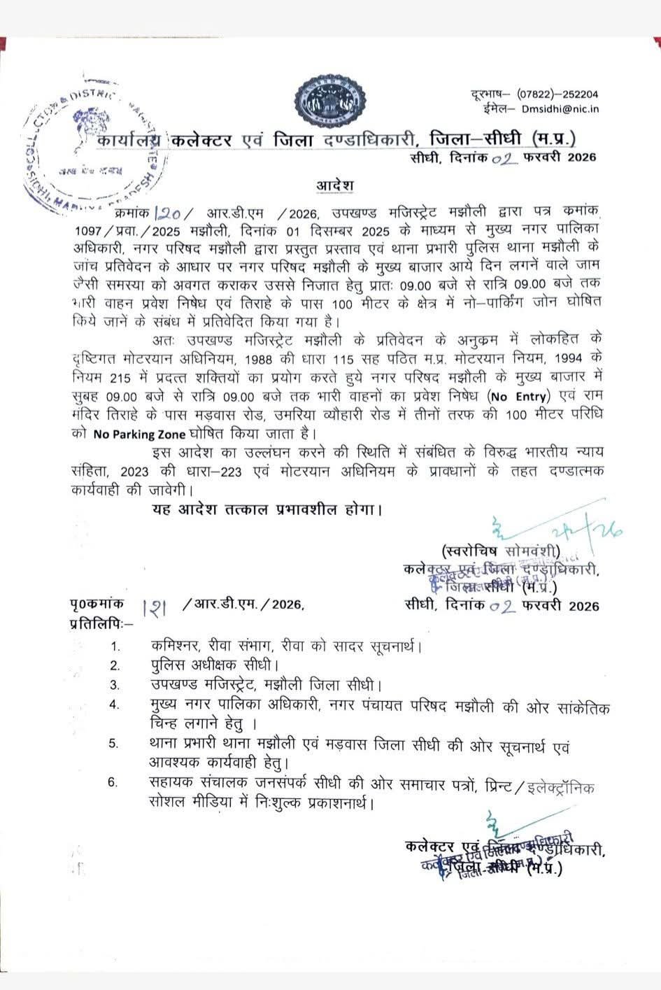 Sidhi जिले के मझौली के मुख्य बाजार में दिनभर ‘नो एंट्री’, मंदिर–तिराहों के 100 मीटर दायरे में ‘नो पार्किंग’ घोषित, आदेश तत्काल प्रभावशील