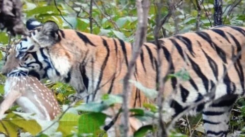 T17 बाघिन ने चीतल का किया शिकार, बच्चों के लिए मुंह में दबाकर ले जाती आई नजर