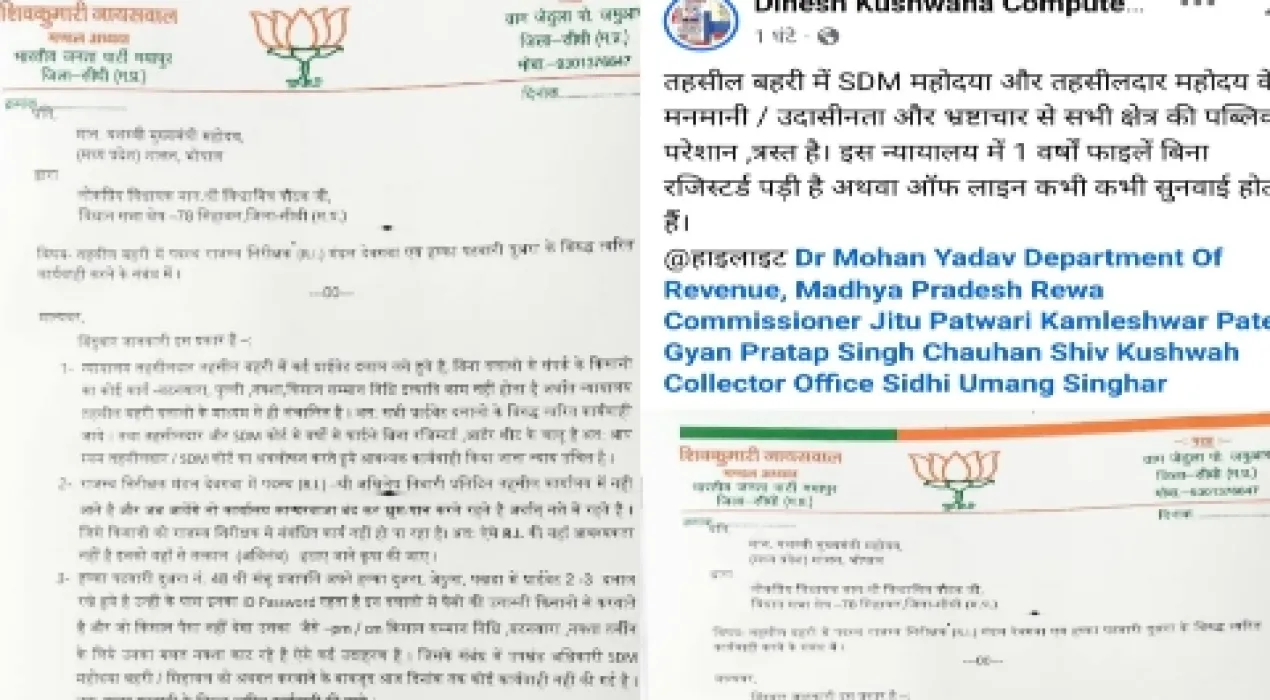 एमपी के सीधी जिले की तहसील बहरी में राजस्व तंत्र की कार्यप्रणाली पर गंभीर सवाल उठाते हुए शिवकुमारी जायसवाल ने मुख्यमंत्री और स्थानीय विधायक को शिकायत पत्र सौंपा है। जहा भारतीय जनता पार्टी की मंडल अध्यक्ष के रूप में उन्होंने प्रशासनिक व्यवस्था में कथित अनियमितताओं, दलालों के हस्तक्षेप और किसानों के कार्यों में देरी को लेकर कड़ा एतराज़ जताया है। वही पत्र मुख्यमंत्री डॉ. मोहन यादव और सिहावल विधानसभा क्षेत्र-78 के लोकप्रिय विधायक विश्वामित्र पाठक को संबोधित किया गया है।