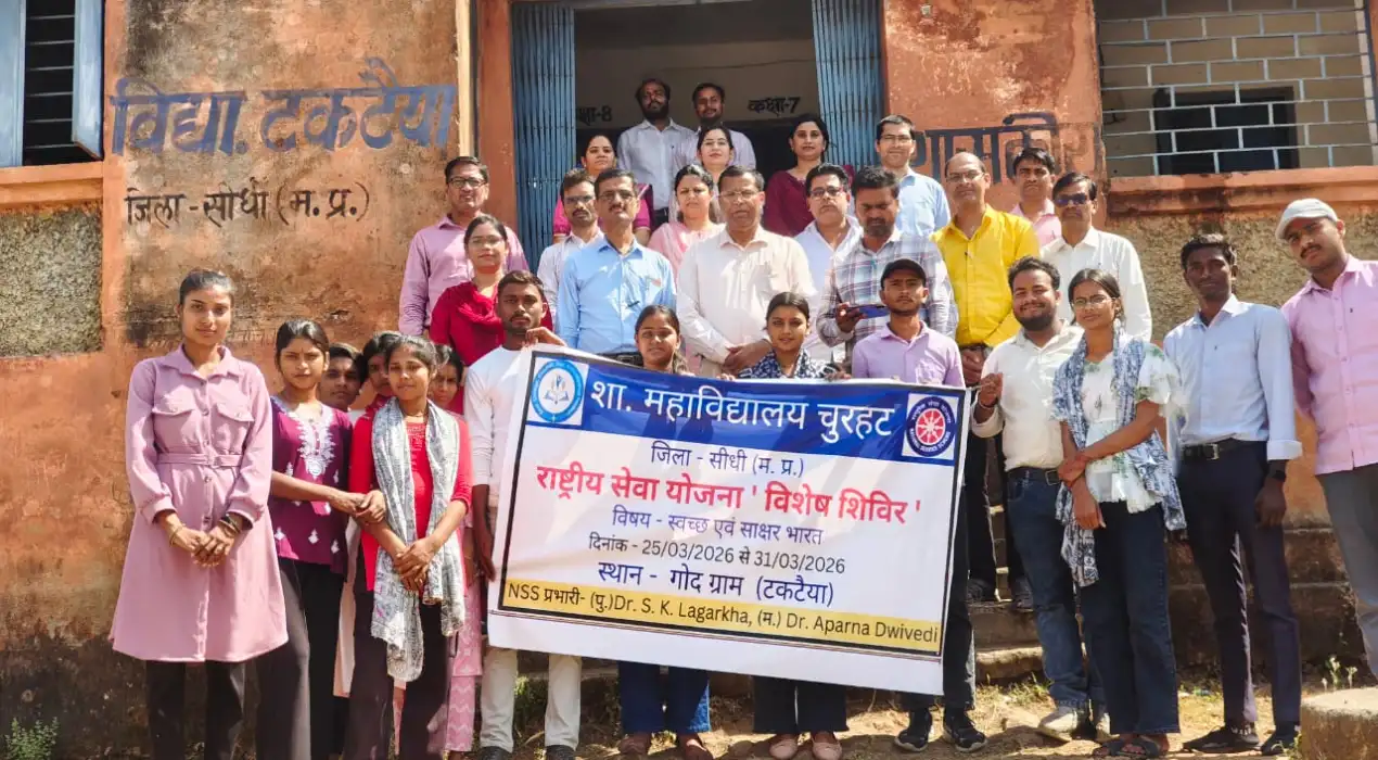सीधी जिले के चुरहट स्थित शासकीय महाविद्यालय द्वारा ग्राम टकटैया में आयोजित 7 दिवसीय राष्ट्रीय सेवा योजना (NSS) विशेष शिविर का सफलतापूर्वक समापन हुआ। दिनांक 01 अप्रैल 2026 को कार्यवाहक प्राचार्य ने पूरे मामले की विस्तृत जानकारी देते हुए बताया है कि यह शिविर “स्वच्छ एवं साक्षर भारत” विषय पर दिनांक 25 मार्च 2026 से 31 मार्च 2026 तक संचालित किया गया, जिसमें स्वयंसेवकों ने उत्साहपूर्वक भाग लेते हुए सामाजिक सेवा और जागरूकता का संदेश दिया।